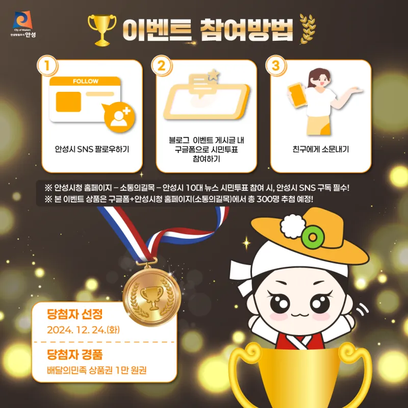 #안성 #안성시 #문화도시 #안성여행 #경품이벤트 #이벤트 #팔로우이벤트 #SNS이벤트 #안성시청 #뉴스 #연말 #올해의뉴스 #TOP #투표 #현대백화점 #상품권