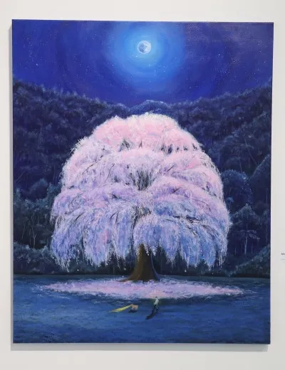 커다란 꽃나무 아래 거니는 사람의 모습이