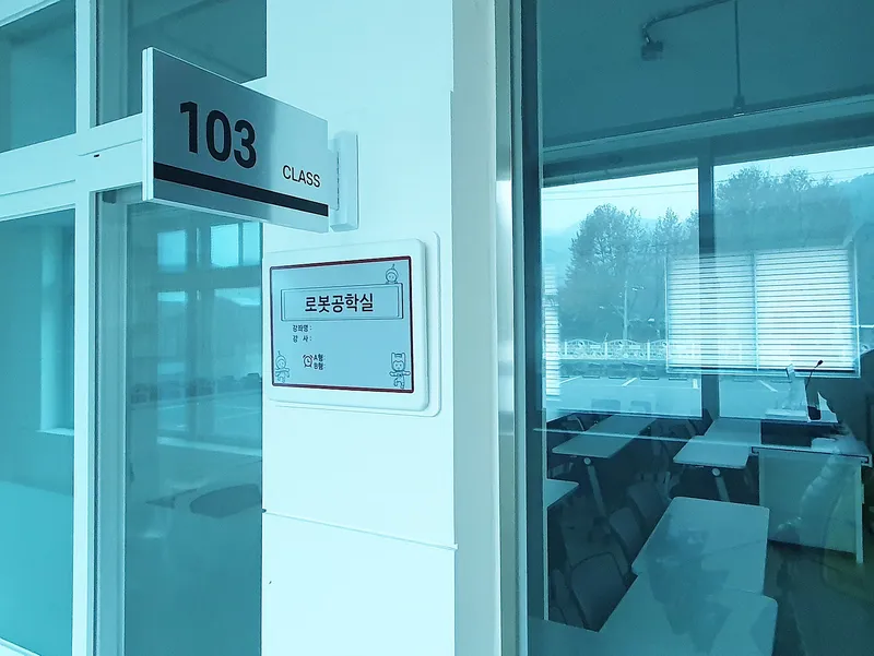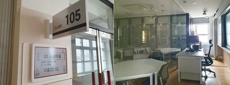 102호는 모둠창작실, 103호는 로봇공학실, 105호는 3D 프린터실, 106호는 로봇쉼터입니다.