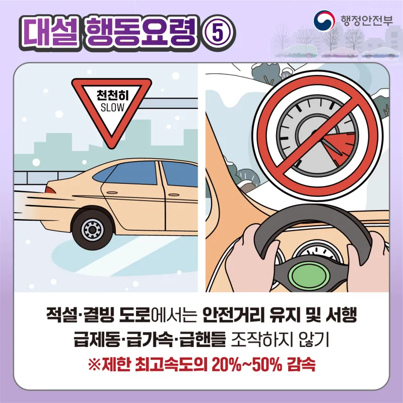적설·결빙 도로에서는 서행하며 급제동, 급가속, 급핸들 조작을 피해야 합니다.