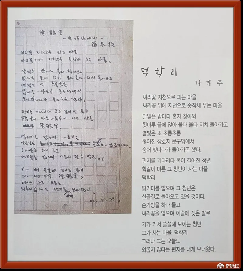 연구 발표에서는 특별히 '나태주' 시인의 친필 시 '덕학리'가 소개됐다. 1972년, 나태주 시인이 개인적으로 친분이 있던 도덕초등학교의 모 선생님 댁에서 1박을 하고 가며 남긴 시(詩)라고 한다.