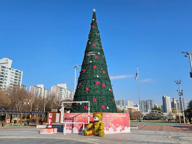 🚇역 뒤편에 있는 구리광장에는 대형 🎄트리가 세워져 있어요. 낮에 봐도 좋지만 밤에 🔮불이 켜지면 훨씬 예쁘더라고요.