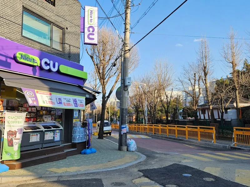 호수 오른쪽으로 쭉 🚶♀️걸어나가면 🏪편의점이 보이는데요. 여기서 길이 계속 이어져요.