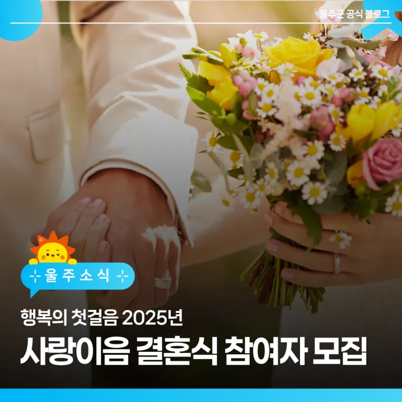 예식장소 무료 대관부터 웨딩패키지 지원까지! 부부의 첫 출발을 응원하기 위해 울주군이 관내 아름다운 장소에서 검소하고 의미 있는 결혼식을 진행할 사랑이음 결혼식 참여자를 모집합니다.