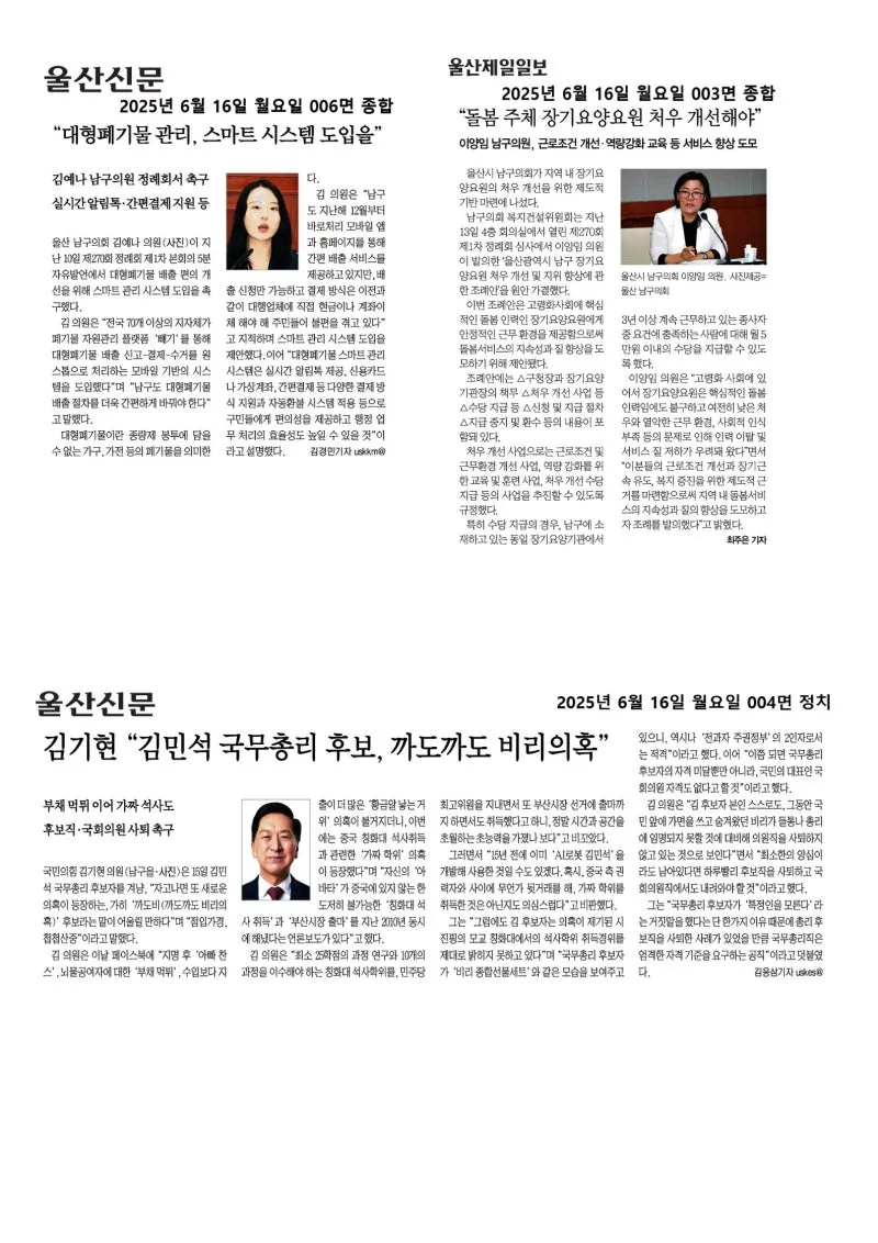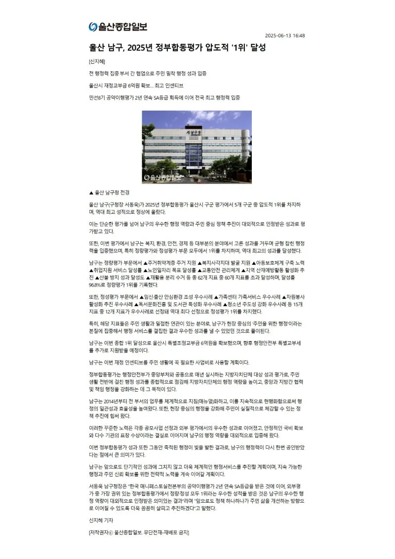 {"title":"[행복남구 오늘의신문] 🏆2025년 정부합동평가 남구, 울산 지역역 1위!🥳 (●'◡'●) (6월 16일 월요일)","source":"https://blog.naver.com/ulsan-namgu/223900618610","blogName":"울산광역시..","domainIdOrBlogId":"ulsan-namgu","nicknameOrBlogId":"울산광역시남구청","logNo":223900618610,"smartEditorVersion":4,"meDisplay":true,"lineDisplay":true,"outsideDisplay":false,"cafeDisplay":false,"blogDisplay":false}