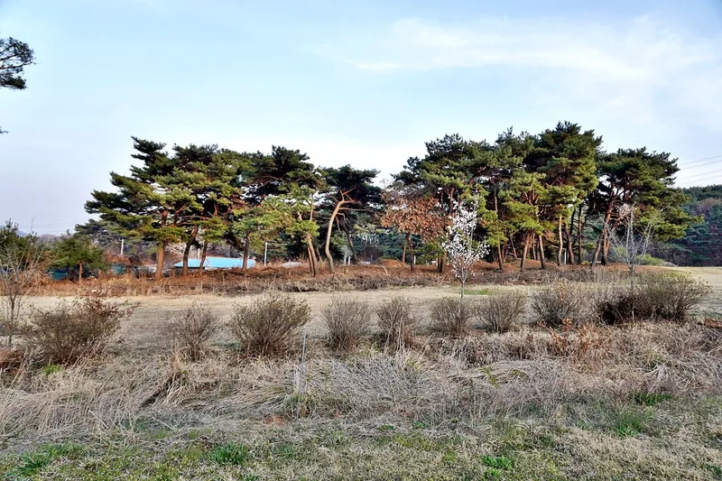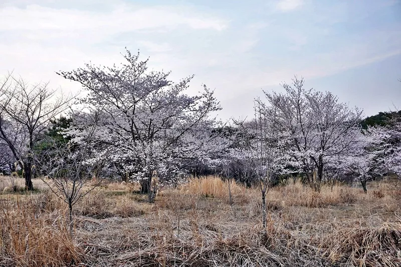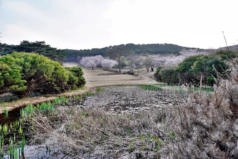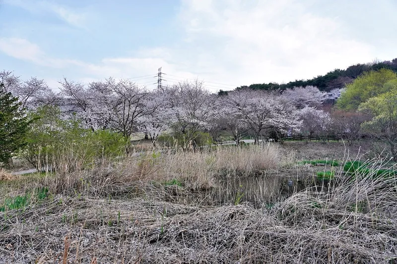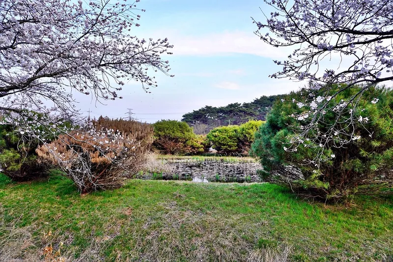 생태공원 주변으로는 민가도 많지 않아 한적하면서도 고즈넉합니다. 4월 산책로를 따라 푸른 소나무 숲과 벚꽃 만개한 봄꽃이 화려합니다.