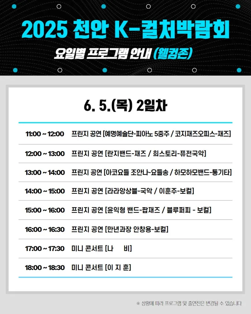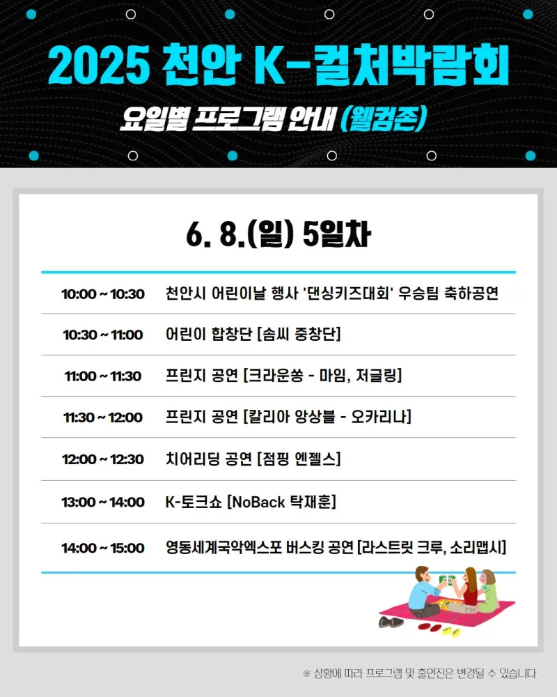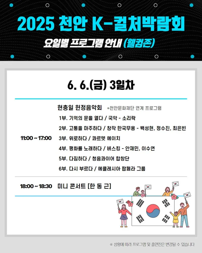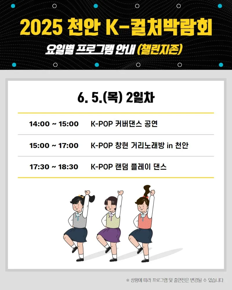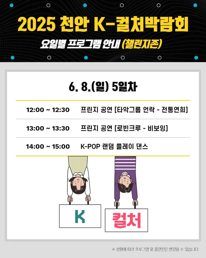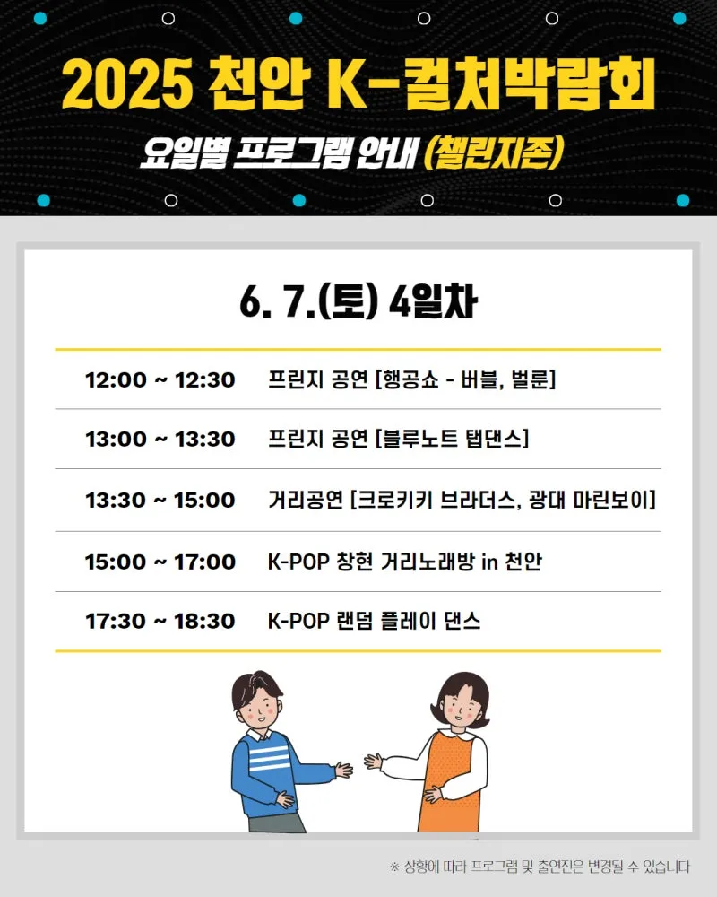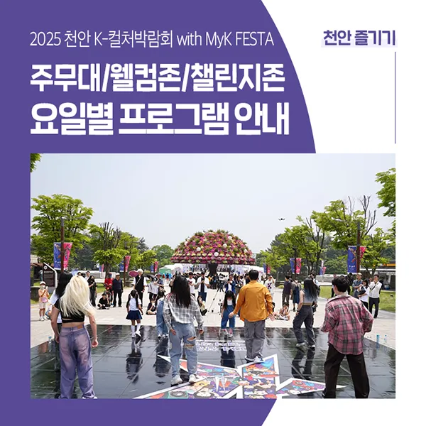 MyK FESTA와 함께 하는 ‘2025 천안 K-컬처박람회’ <주무대/웰컴존/챌린지존 요일별 프로그램 안내>