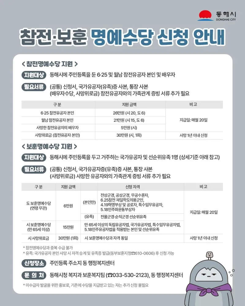 📌문의처: 동해시청 복지과 보훈복지팀(☎033-530-2123), 동 행정복지센터