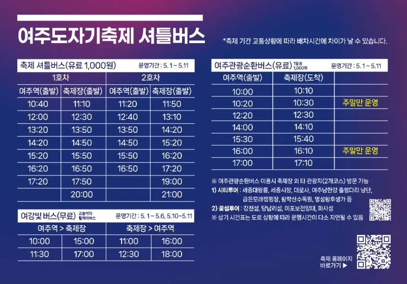 여주역과 축제장을 오가는 무료 셔틀버스가 운영되며, 방문 전 시간표를 확인해두면 더욱 편리하다.