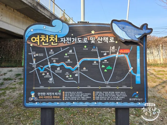 중간중간에 여천천으로 진입할 수 있는 길들이 많지만 저는 광로교(도산 사거리)에서 출발하여 울산도서관을 지나 한비교까지 다녀왔습니다.