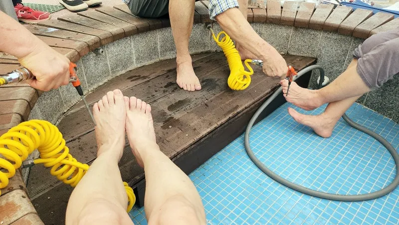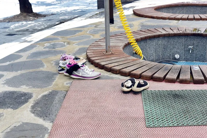 족욕 전 발 씻기는 필수, 신발은 데크 밖에 벗어 둡니다.