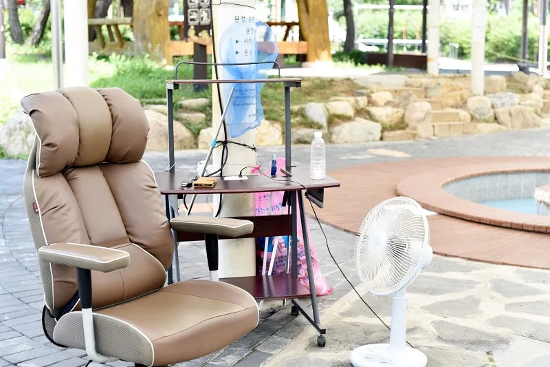 온천지구 족욕장 한쪽에 의자와 테이블,
