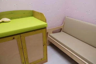 기저귀 갈 수 있는 침대와 편하게 앉아서 수유할 수 있는 소파가 마련되어 있어요.