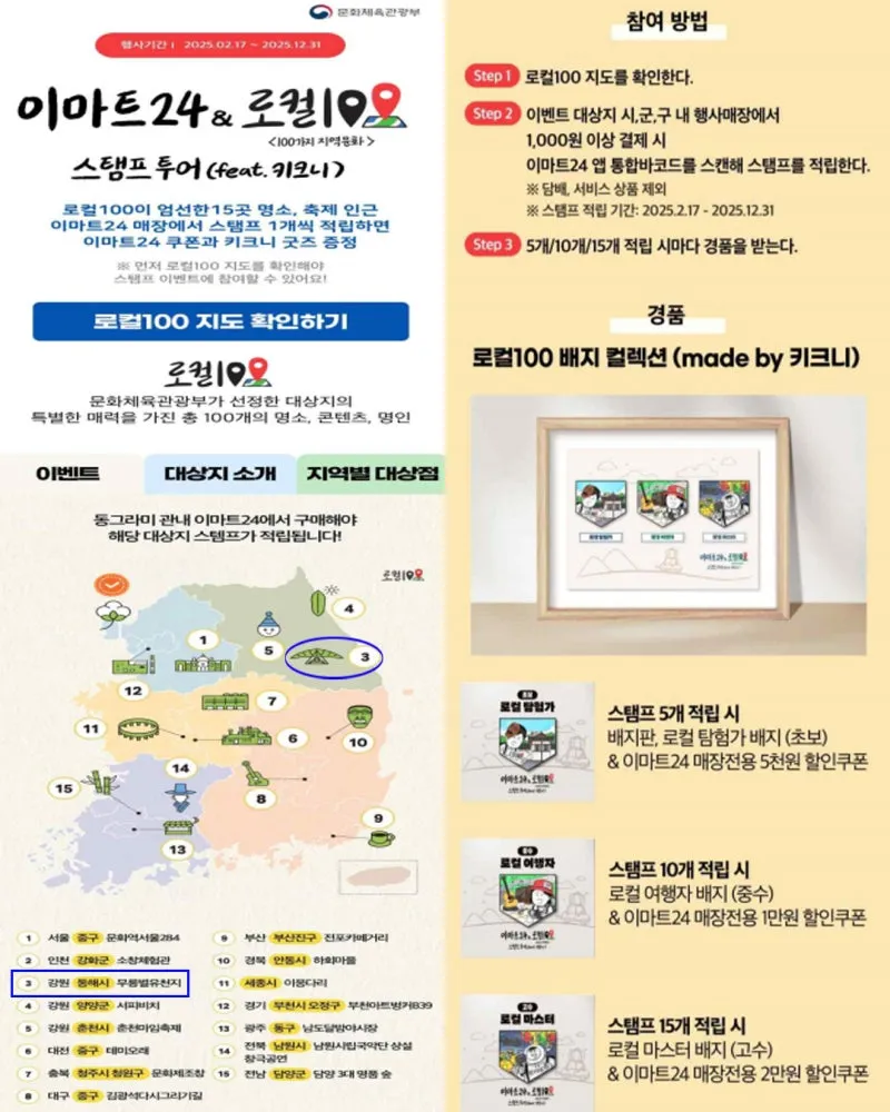 문화체육관광부의 로컬💯이 엄선한 15곳 명소, 축제 인근 이마트24 매장에서 스탬프 1개씩 적립하면 이마트24 쿠폰과 키크니 증정🎁