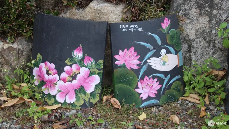 연꽃과 동자승 그리고 꽃 그림이 그려져 있습니다.