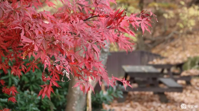 붉은 단풍나무 아래 마련된 피크닉 테이블에 잠시 앉아