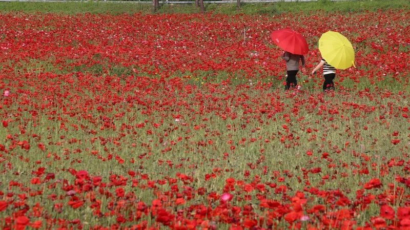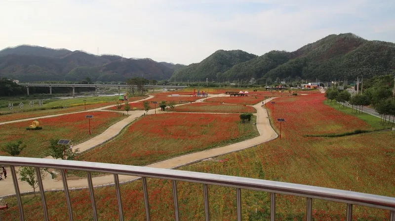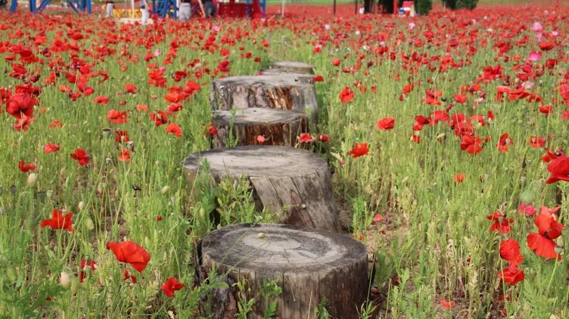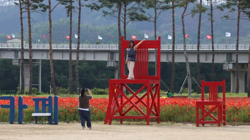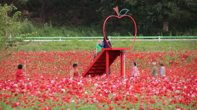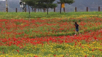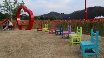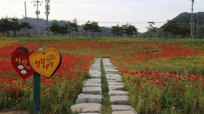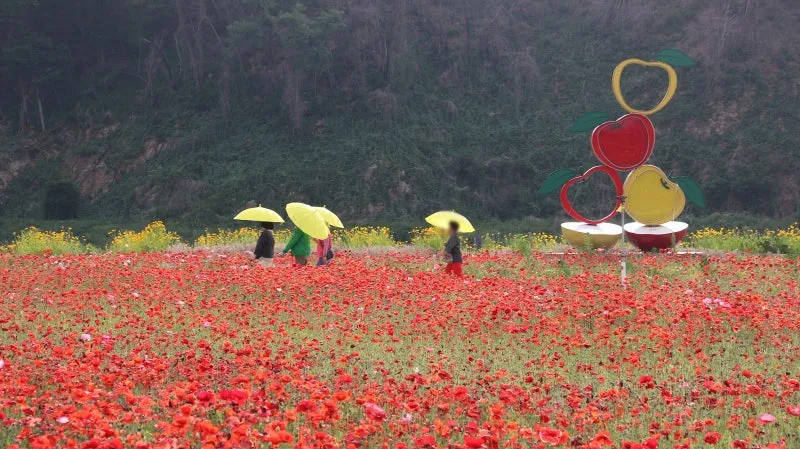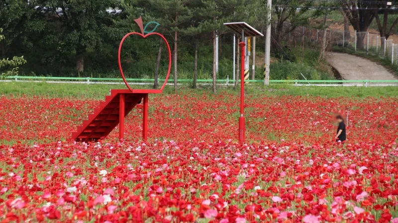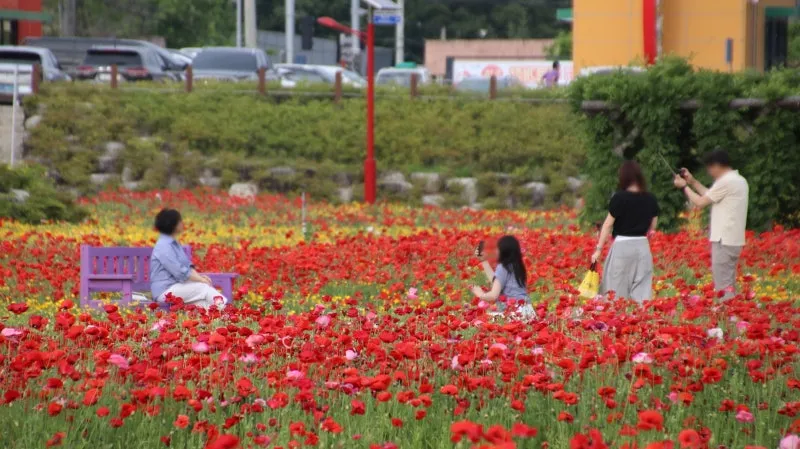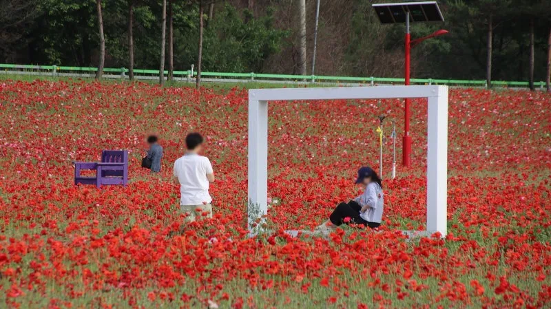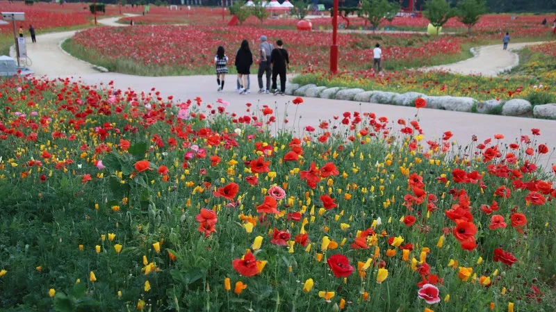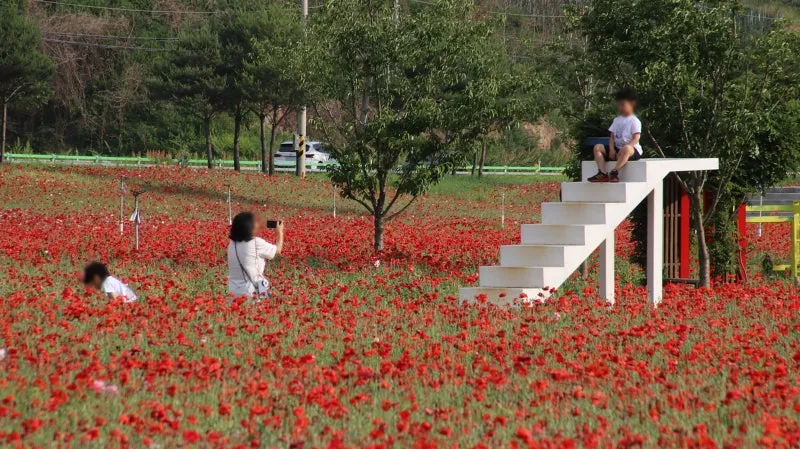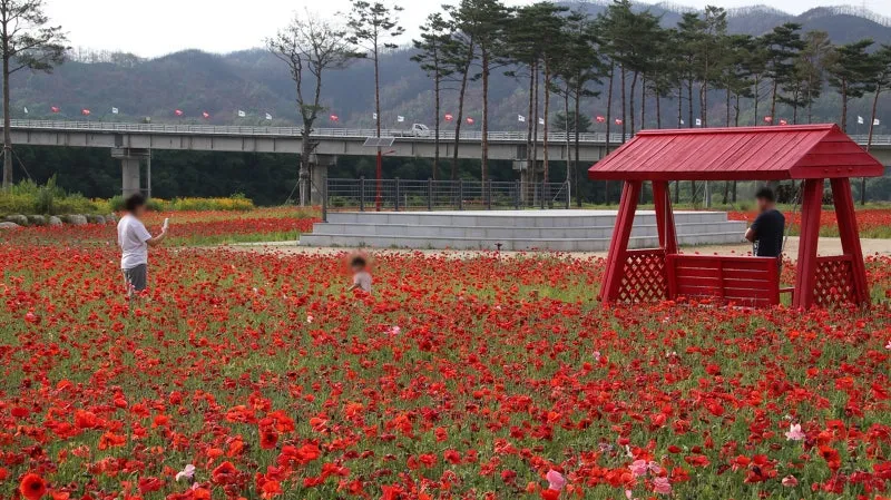 온천지가 붉은 양귀비꽃으로 물든 청송정원