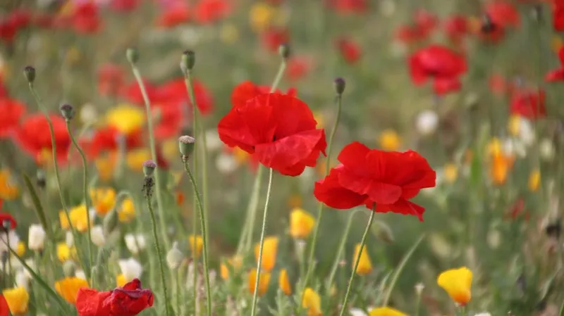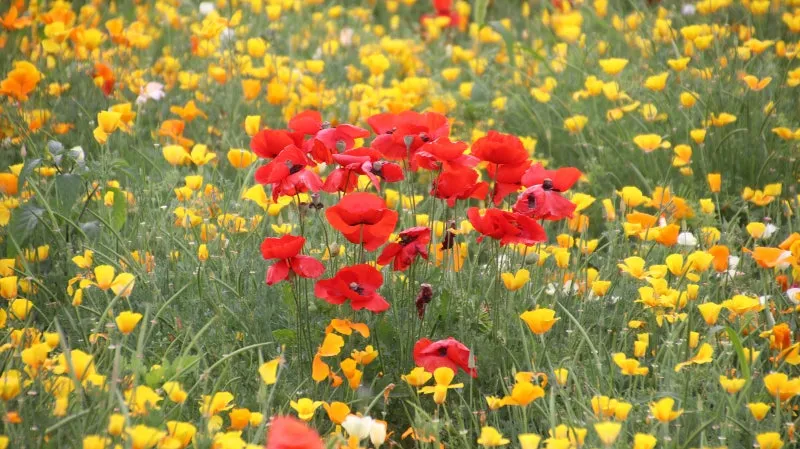 주변으로 노란 꽃이 함께 있어 붉은 양귀비꽃을