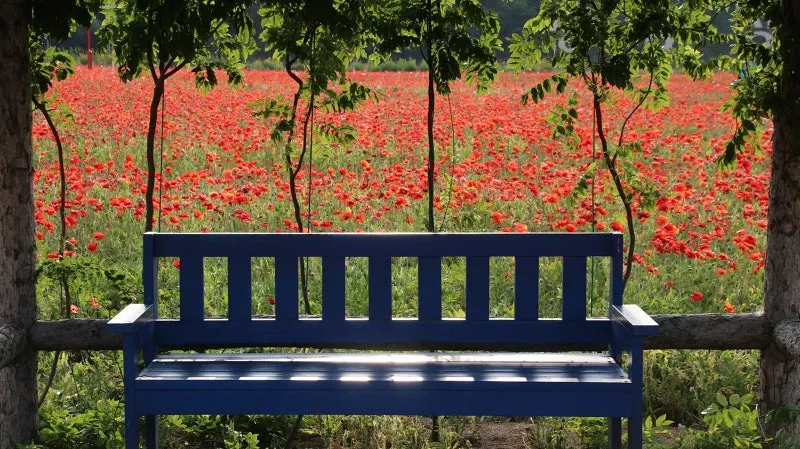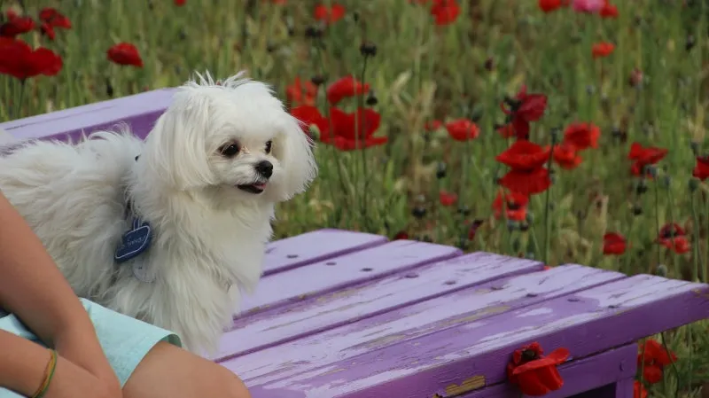 보라색 벤치에 주인과 함께 앉은 반려견은 붉은 양귀비를 보고 신기한 듯