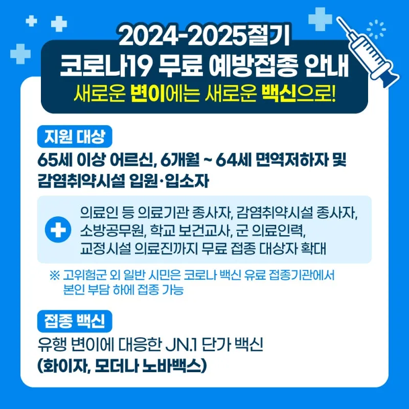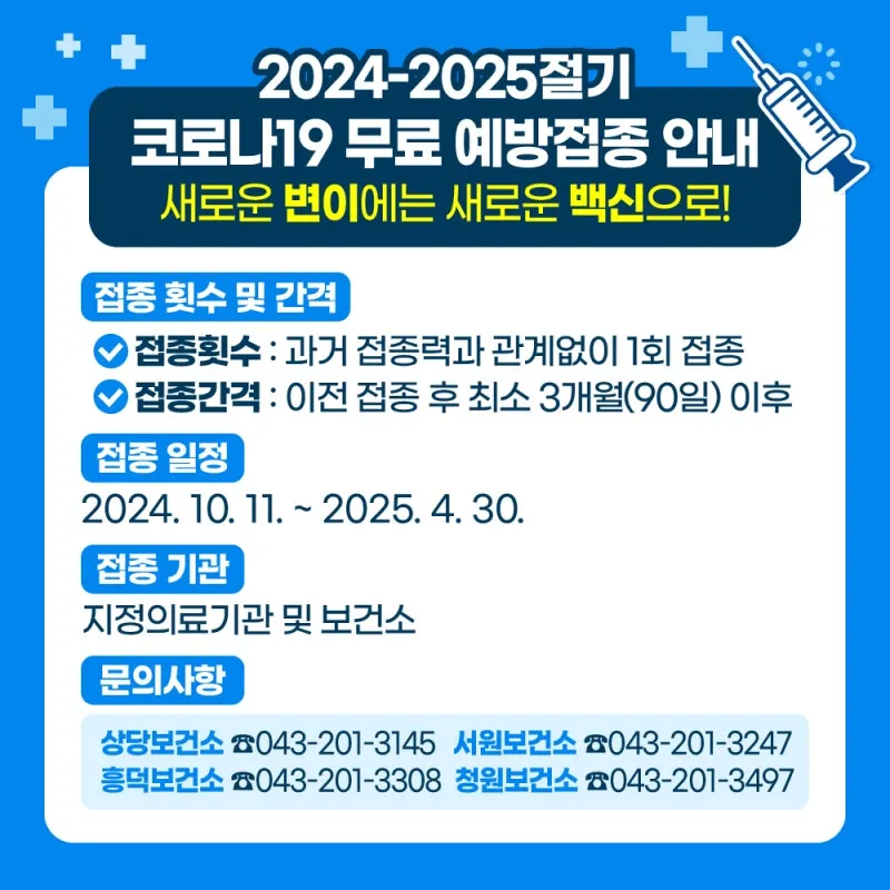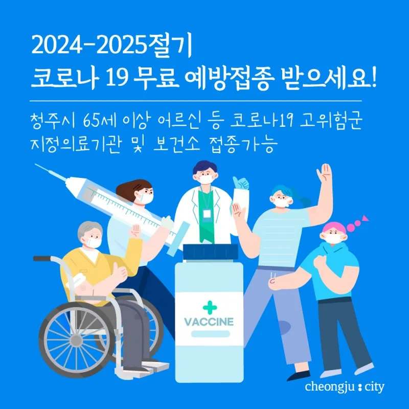 청주시 보건소에서는 65세 이상 어르신과 6개월~64세 면역저하자 및 감염취약시설 입원·입소자 등 코로나19 고위험군을 대상으로 2024-2025 절기 코로나19 무료 예방접종을 실시하고 있습니다.