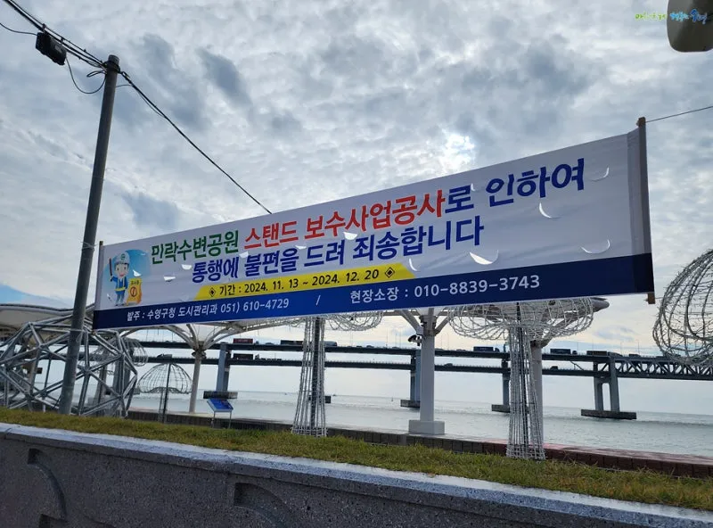 민락수변공원은 현재 스탠드 보수공사 사업 중이었어요.