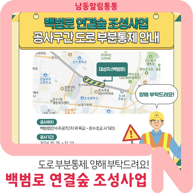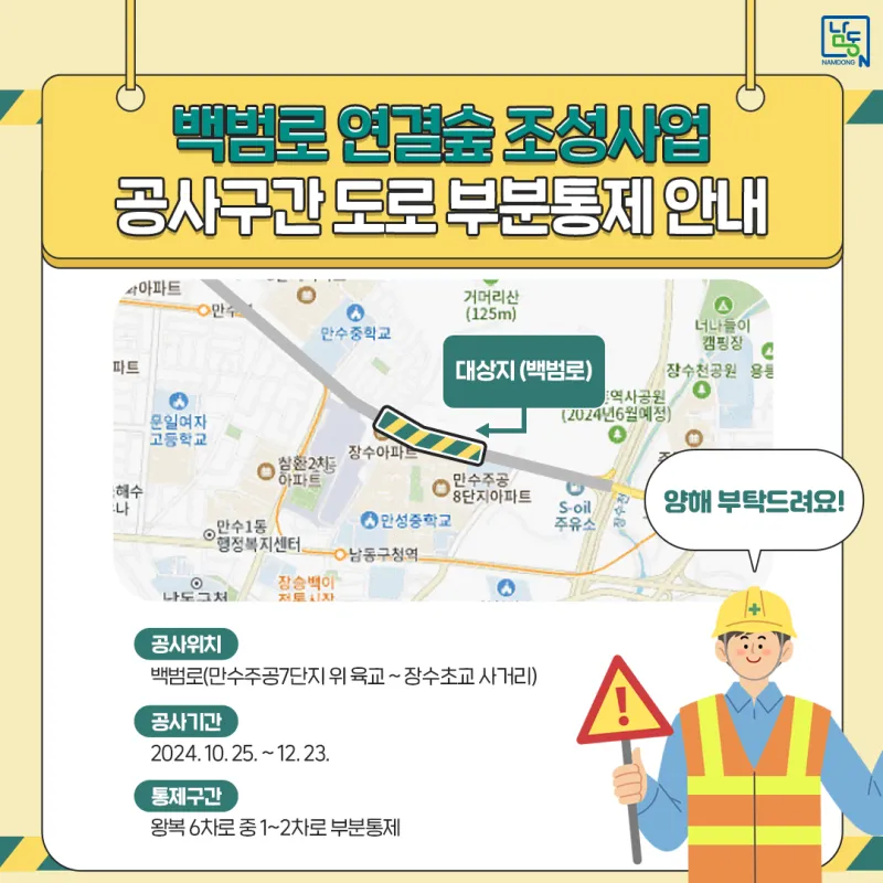 백범로 연결숲을 만들기 위해서 도로 부분통제가 이루어질 예정입니다 :) 공사 위치는 만수주공7단지 위 육교부터 장수초등학교 사거리까지의 백범로로, 공사기간은 10월 25일부터 12월 23일까지 이루어진다고 합니다! 보다 더 나은 남동구, 숲으로 보기 좋은 남동구가 되기 위한 시간동안 도로 부분통제에 대해 여러분의 양해 바랍니다!