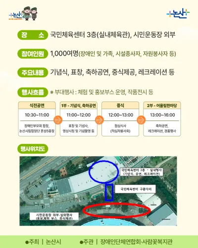 ✔ 식전행사 : 장애인부모회 합창, 논산시립합창단 공연 ✔ 기념식 : 장애인복지 유공자 등 표창, 기념사/축사 등 ✔ 어울림한마당 : 축하공연, 레크레이션(경품추첨 및 시상) 등 |
