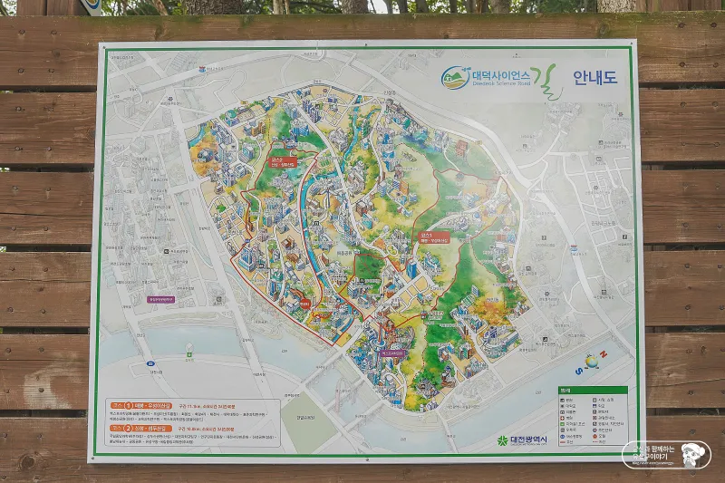 성두산근린공원으로 향하는 길에 도보 여행 코스로 두 가지의 코스를 활용할 수 있는 대덕사이언스길에 대한 안내가 있습니다. 유성온천 관광특구와도 이어져 있어서 다양한 경로로 활용해 볼 수도 있는데요.
