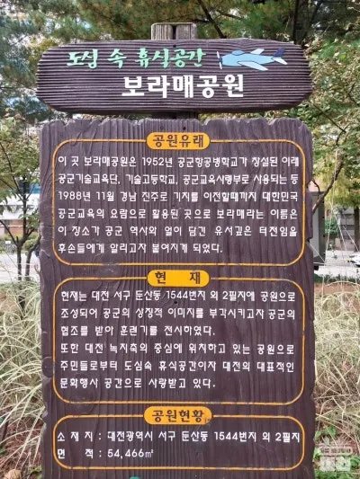 보라매공원은 대전 도시철도 1호선 탄방역 3번 출구 앞입니다. 공원을 거닐면서 전시된 전투기에 대한 지식을 뽐내 보세요.