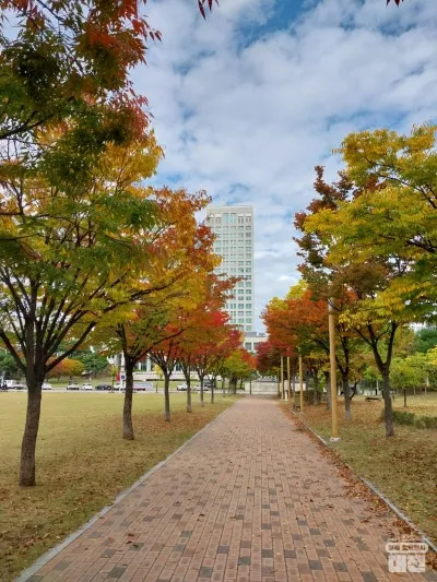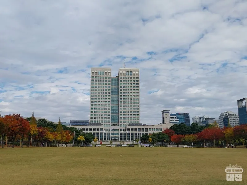 대전광역시청 앞 보라매공원 잔디 밭입니다. 넓고 푸르른 잔디밭과 그 주변으로 울긋불긋 물든 단풍의 풍경이 아름답습니다.