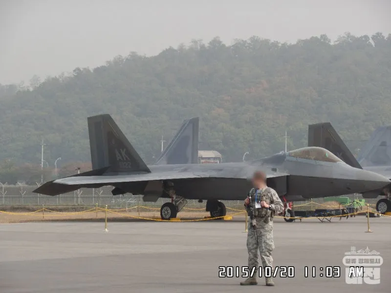 2015년 서울 ADEX(국제 항공우주 및 방위산업 전시회)에서 국내 최초로 선보인 미공군이 운용하는 F-22 랩터입니다. 랩터란 영화 쥬라기월드에서 나오는 재빠르고 영리한 공룡의 명칭입니다. 그 랩터를 별칭으로 쓰는 것처럼 실제 기동이 매우 우수한 전투기입니다.