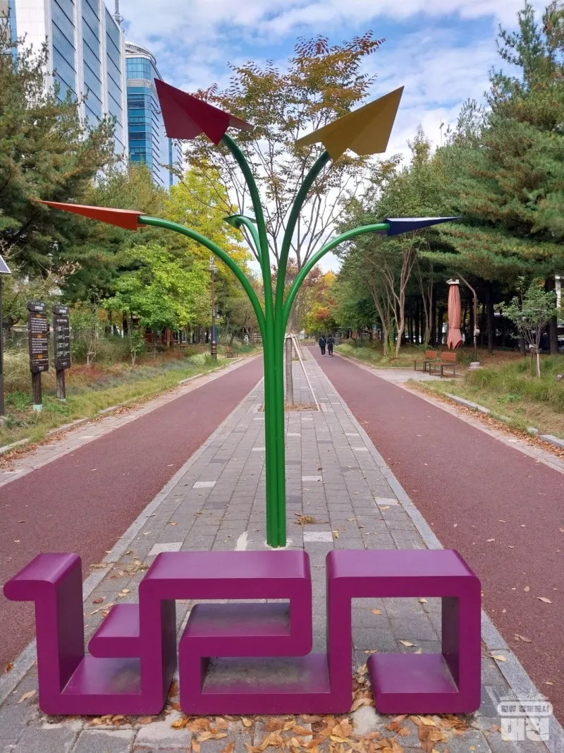 A-37 전시물 뒤로 ‘보라매’의 각 자음을 본 뜬 조형물을 볼 수 있습니다. 날아가는 종이비행기의 모습은 전투기가 이륙하는 모습을 상징하는 것 같습니다. 이곳으로부터 시작하여 대전광역시청 앞 잔디밭까지 보라매공원입니다.