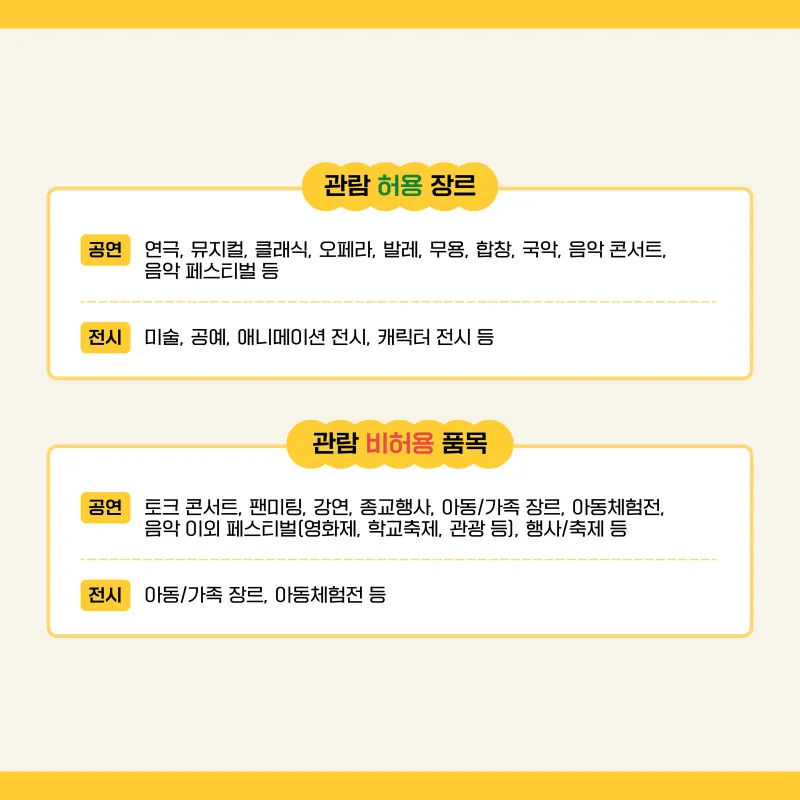 ✔️공연·전시 외 일부 콘텐츠는 지원 제외 (ex. 팬미팅, 토크 콘서트, 아동 체험전 등)