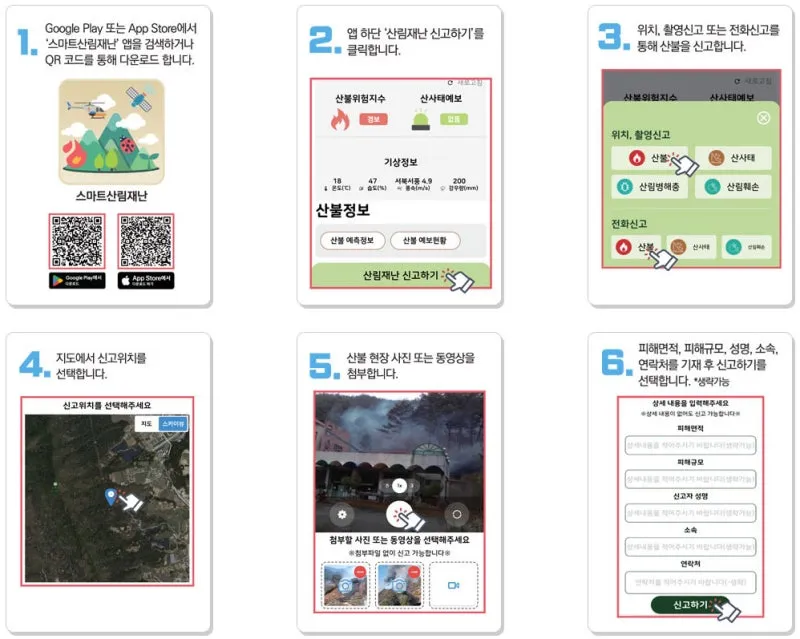 스마트폰 다운로드 설치 앱 '산불신고'를 통해 산불신고가 가능합니다.