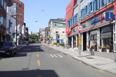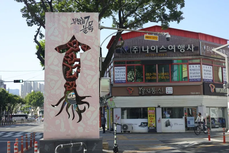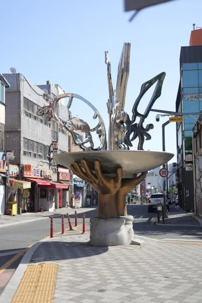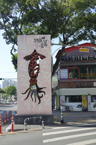 골목 양쪽 입구에는 오징어와 해물 모양의 재미있는 조형물도 설치되어 있어
