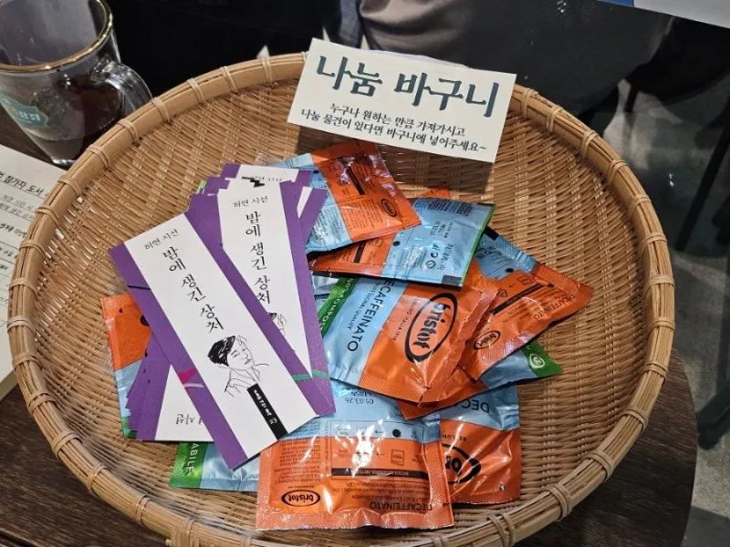 서점 입구에는 시인님의 시 구절이 쓰여진 🔖책갈피와 ☕커피도 놓여있었고 모든 참여자분들에게는 '밤에 생긴상처' 📒시집과 🍫달콤한 디저트/커피 쿠폰도 제공되었어요.